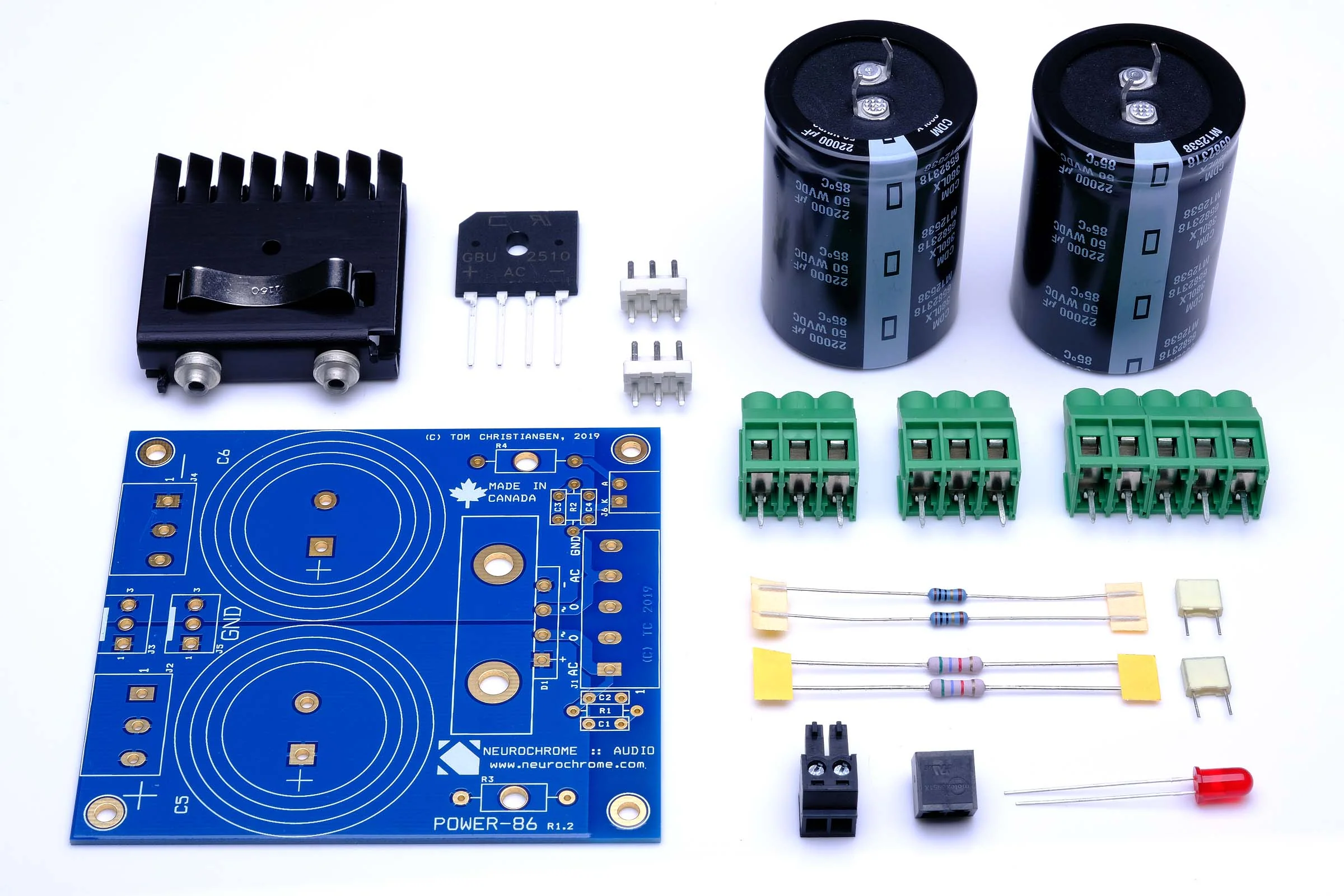 The Power-86 Power Supply Board is a companion board for the state of the art Neurochrome composite amplifiers. The intended use is for one Power-86 board to power two Modulus-86, Modulus-286, or LM3886DR in a stereo amp. It is also possible to use one Power-86 board to power a mono block or, with a slight reduction in peak output power, more than two Modulus-86 or LM3886DR boards.